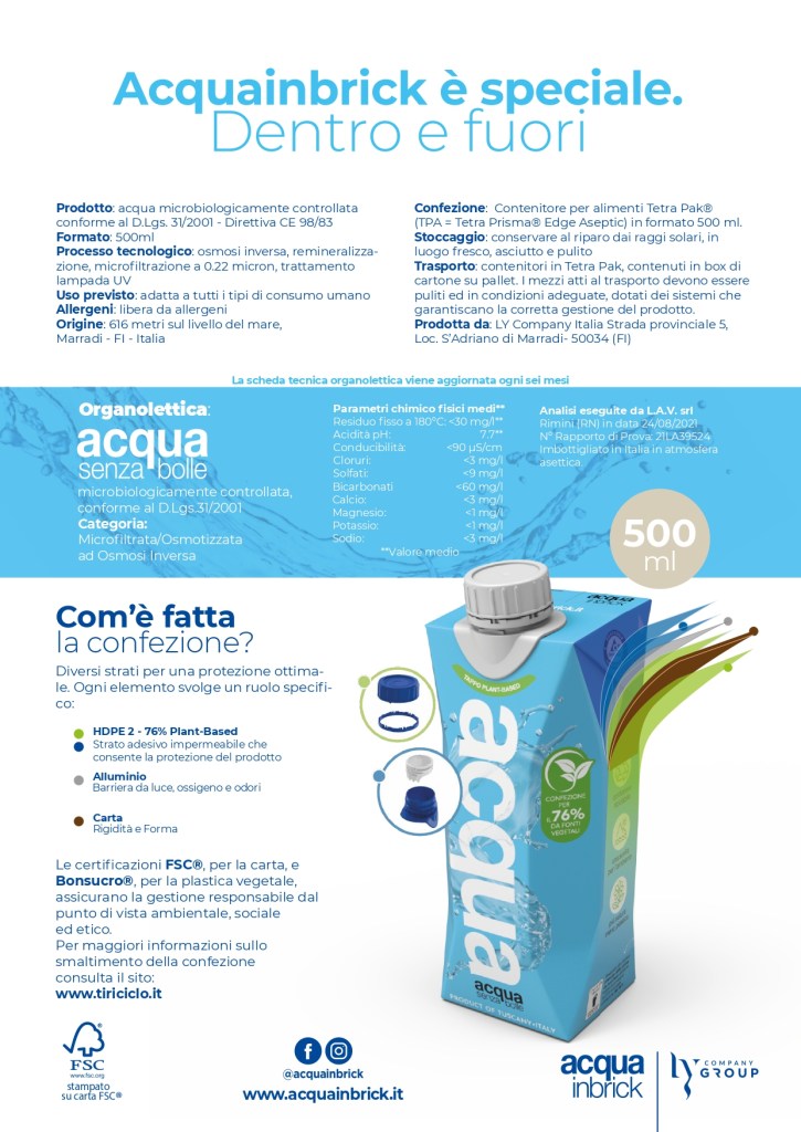 Mohamed spiega:Abbiamo scelto il brick di Tetra Pak per l’acqua da passeggio perché è composto da oltre il 70% di materia di origine vegetale (76% per quello da 500ml) che ben si presta ad uno smaltimento agile e controllato. La percentuale così alta di materia vegetale (di cui carta certificata FSC, tappo e film in HDPE plant-based certificato Bonsucro, ottenuto dalla polimerizzazione degli scarti della filiera della canna da zucchero) fa intendere fin da subito il risparmio di plastica fossile immessa in commercio.”